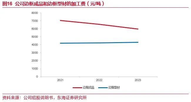 在销售端,铝边框采用“公开市场铝锭价格+边框加工费”的定价模式,铝价波动由下游组件厂商承担。2021年之前,铝锭价格较为稳定,基本维持1.3万元/吨的水平。2021年下半年起,铝锭价格因能耗双控、限电限产大幅上涨,价格一度高达2.3万元/吨,此后铝价回落,2022年下半年起价格基本稳定在1.85万元/吨左右。2024年初铝价小幅上涨,并于年中回落至2万元/吨以下。在成本端,边框厂商采购铝棒采用“公开市场铝价+铝棒加工费”的定价模式,2021-2023年公司采购的铝棒加工费占铝棒单价的比例在2.97-4.79%之间,保持相对稳定,铝棒采购单价与公开市场铝价走势基本一致。