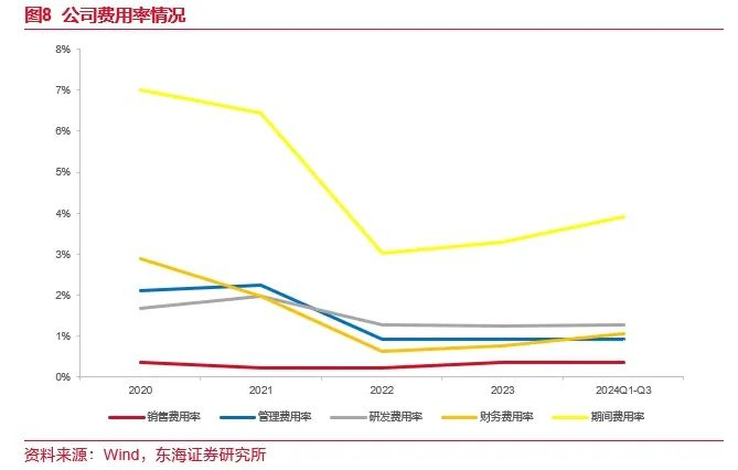 公司费用管理能力出色,期间费用率整体呈下降趋势。2020-2023年公司期间费用率分别为7.01%、6.43%、3.02%、3.28%,随着公司收入规模快速增长,规模效应逐渐显现,期间费用率总体呈下降趋势。销售费用率较低,主要系客户相对集中,且公司已与主要客户建立了稳定、良好的合作关系,需要投入的销售资源和开展的销售活动相对较少。研发费用率整体保持稳定,随着公司业务规模不断扩大,研发投入规模亦随之上升。财务费用率较高,主要与公司业务结算模式以及新产能建设相关,2021年末公司通过股权融资取得10亿元投资款,置换了相应的借款资金需求,加之公司资产规模快速增长背景下银行贷款利率有所下调,公司财务费用率呈现下行趋势。