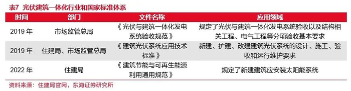 建设标准:2019年,市场监管总局制定了《光伏与建筑一体化发电系统验收规范》,规定光伏与建筑一体化发电系统验收以及结构相关工程、电气工程等分项验收基本要求;同年,住建局、市场监管总局出台《建筑光伏系统应用技术标准》,规定新建、扩建、改建建筑光伏系统的设计、施工、验收和运行维护要求;2022年,《建筑节能与可再生能源利用通用规范》提出新建建筑应安装太阳能系统。