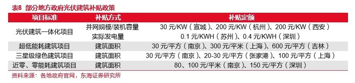 政策补贴:不少地区对于光伏建筑一体化项目按照实际发电量(0.1-0.4元/KWH)、装机容量/并网规模(30-200元/KW)进行补贴,对于超低能耗建设项目、星级绿色建筑项目、近零(零)能耗建筑项目则按照建筑面积进行补贴,金额最高达600元/平方。一些地区还依据建筑节能项目对该地区节能减排降碳的贡献按比例给予资金匹配补助,光伏BIPV项目已成为各地政府重点关注项目之一。