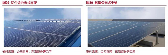 公司光伏支架销售体量已初具规模。公司光伏支架产品主要应用于分布式屋顶发电系统固定支架,包括钢檩条、铝合金压块等光伏支架结构件,可满足混凝土平面屋顶、钢结构平面屋顶、彩钢瓦斜面屋顶等多种应用场景的使用需求,产品在拥有良好力学性能的同时,兼具安装便捷的优点。2021年,公司光伏支架产品产生少量收入,2022年已开始小规模生产,2022-2023年分别贡献收入0.58亿元、1.45亿元。
