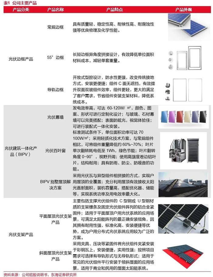 光伏边框业务为核心,多产品横向延伸。公司主营光伏边框业务,推出55°边框、导轨边框等边框自研产品,具有轻量化、稳定性高、耐候性高、耐腐蚀性强等特点,能够满足客户减重、防水、安装便捷等不同需求,可显著提高客户光伏组件寿命。而后公司在光伏产业链内进行延伸,凭借多年产业积累,先后布局光伏支架以及光伏建筑一体化(BIPV)的研发、生产和销售业务。