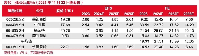 我们采用PE估值法,选取四家可比公司,其中,光伏边框厂商高测股份、光伏支架厂商中信博和公司业务类似,福莱特和公司同为光伏辅材重资产环节的龙头,鼎胜新材和公司同为新能源铝加工领域的龙头,2024-2026年其平均PE分别为21.51/15.99/12.35倍。公司成本、规模和技术持续领跑行业,布局再生铝降低原材料成本,扩充产能推动市场份额提升,拓展海外市场获取高毛利,光伏边框龙头地位稳固。参考可比公司估值,首次覆盖,给予“买入”评级。