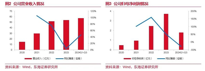 光伏边框领军者,经营规模持续扩大。公司成立于2016年8月,并于2024年6月在上交所主板上市,以光伏边框业务为核心,在光伏产业链内延伸布局光伏支架以及光伏建筑一体化(BIPV)的研发、生产和销售业务。公司经过多年的技术积累,在产品结构设计、规模化生产、产品质量控制、成本控制等方面积累了丰富的行业经验,已成长为国内领先的铝合金光伏结构件制造商之一。2023年,公司实现营业收入53.91亿元,同比增长4.05%,实现归母净利润3.71亿元,同比增长50.74%。2024年前三季度,公司实现营业收入57.35亿元,同比增长47.07%,实现归母净利润1.78亿元,同比下降29.35%。