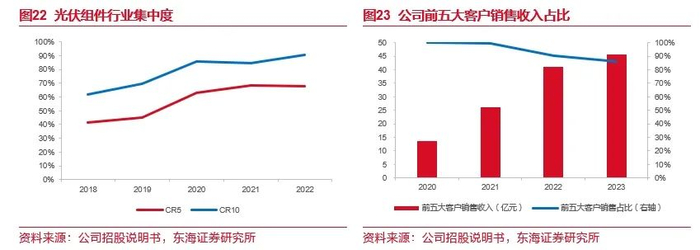 公司客户资源优势明显,深度绑定头部组件厂商。近年来光伏组件市场格局趋于集中,隆基绿能、天合光能、晶澳科技、晶科能源、阿特斯等头部厂商连续多年占据全国光伏组件出货量前五名。根据索比光伏网数据,2022年国内光伏组件市场CR5已超过65%,CR10已超过90%。公司凭借过硬的产品质量和优秀的供货能力,与国内头部光伏组件制造商建立了长期稳定的合作关系,其中,天合光能、晶澳科技、阿特斯间接或直接持有公司股份,实现上下游深度绑定。此外,公司加大市场开发力度,不断开拓优质客户资源,逐步切入了正泰新能源、一道新能、爱旭股份等光伏组件厂商。