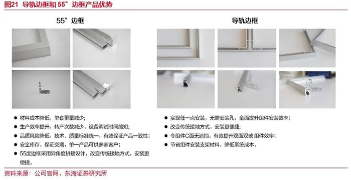 公司具备过硬的产品质量与高效交付能力,能够持续高效响应客户需求。在铝型材方面,公司拥有“一模多孔”模具的自主研发及批量制造能力,可以对分流孔流量分配、模具厚度等关键点进行高精度控制,满足下游客户定制化的需求,自主设计开模,在兼顾型材生产效率、减低生产成本的同时能够有效保证产品的质量。在边框成品方面,公司推出拥有自主知识产权的导轨边框和55°边框,其中,55°边框颠覆了传统边框的设计结构,相较之下成本可下降10%。公司能够深入地理解客户的设备与需求,在保证产品质量的同时提供高效规模化供货。