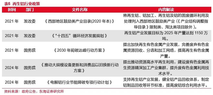 我国电解铝产能已接近天花板,政策持续利好再生铝。原铝生产是以铝土矿为原材料,经氧化铝电解生成电解铝,再铸造成铝锭。再生铝则是由废旧铝合金材料或含铝废料,经重新熔化提炼而得到的铝金属原料。根据国家发改委、工信部等部门联合发布的《有色金属行业碳达峰实施方案》,我国将坚持电解铝产能总量约束,严格执行电解铝产能置换办法。电解铝继续增长的空间有限,我们预测未来新增用铝需求将依靠再生铝满足。近年来,国家也相继出台多个政策性文件,支持再生金属行业发展,预计2025年中国再生铝行业年产量达1150万吨。