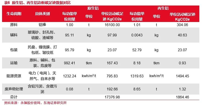 再生铝边框在实现节能减排、低资源消耗的同时,可显著降低光伏边框的材料成本。原铝能耗较高且对环境污染较为严重,而每吨再生铝质光伏边框的生产能耗仅为原生铝的3%,生产1吨再生铝可节约3.4吨标煤,节省14吨水资源,减少固体废弃物排放20吨,并且再生铝碳排放量仅为0.23 吨,是电解铝生产带来碳排放的2.1%,可大幅减少光伏产业链碳排放。此外,再生铝所用废铝价格显著低于原铝,可在原料端降低边框成本。