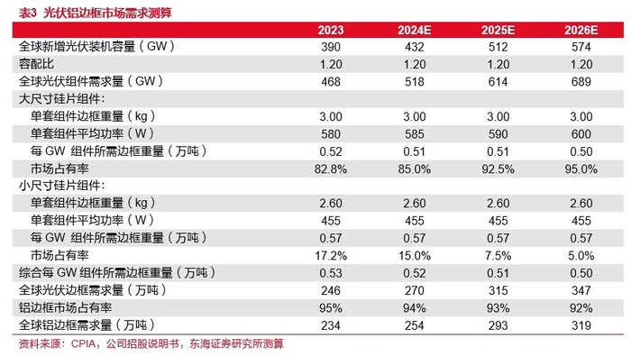 基于CPIA数据,根据以下主要假设,我们测算2024-2026年的光伏铝边框行业市场需求: