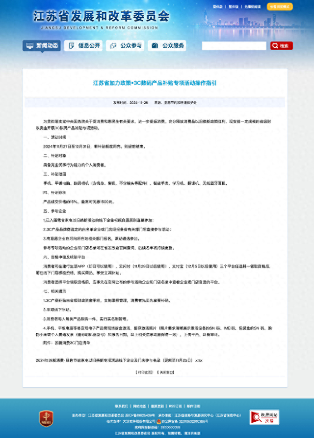 11月26日晚,江苏先后发布《3C数码产品补贴专项活动操作指引》、《关于2024年苏新消费·绿色节能家电以旧换新专项活动新增补贴商品品类的通告》。加力释放消费品以旧换新政策红利,江苏省消费补贴再扩容,新增7类3C产品和20类家电商品,享受15%专项补贴。