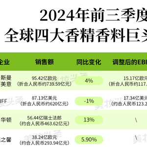 随着香氛市场需求持续上升,四大巨头的香精香料业务也呈现出稳健的增长态势。帝斯曼-芬美意的香氛与美容业务在第三季度表现尤为突出,营收同比增长8%,调整后的EBITDA同比增长7%。IFF的香氛业务部门在前三季度总体营收同比增长8%,调整后的EBITDA从去年同期的3.53亿美元升至4.21亿美元。奇华顿香水与美容部门业务在前三季度销售额达到27.82亿瑞士法郎(约合人民币229.53亿元),按固定汇率计算增长了15.6%。德之馨的香氛与护理业务在前三季度销售额实现14.75亿欧元(约合人民币113.38亿元),同比增长9.8%。