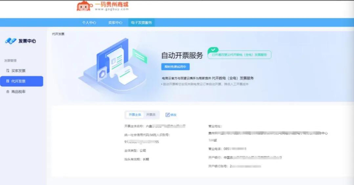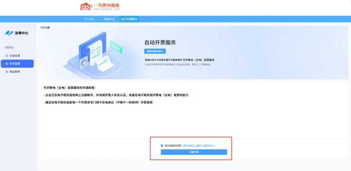 商家进入一码贵州商城 https://www.gogbuy.com/登录店铺账号后点击“电子发票服务”进入发票中心。选择代开发票,勾选协议后申请开通(目前限时免费试用中)