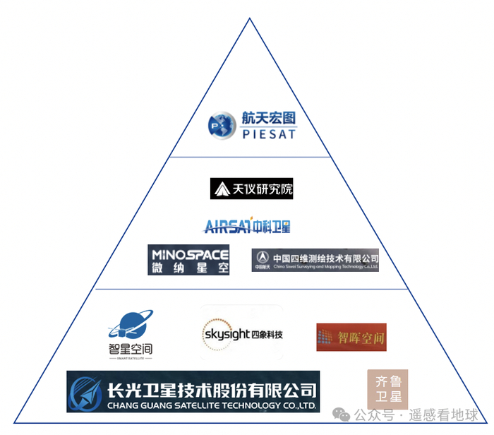 长光卫星9颗(吉林一号系列),中国四维6颗(世景系列),二十一世纪5颗(北京三号系列),微纳空间2颗(泰景系列),齐鲁卫星1颗(齐鲁系列),陆海空间2颗(东方慧眼系列)。按照卫星数量来对公司分级,大概如下: