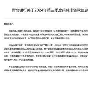 昨日,青岛银行在官网发布了关于2024年第三季度碳减排贷款信息披露的公告。