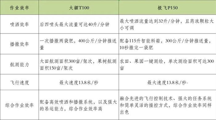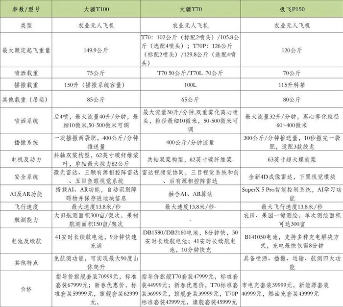 下面我们针对极飞P150 Pro / P150s 和T100、T70系列的对比来看看两家企业的产品特征,以及从产品的竞争来洞察植保无人飞机行业的竞争特点和发展趋势。