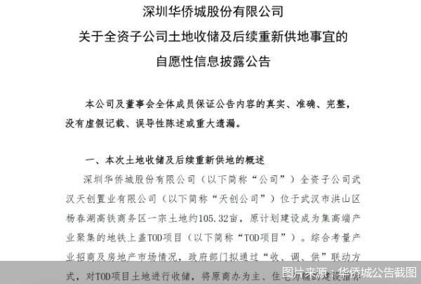 这块即将被地方政府收回的地块位于武汉市洪山区杨春湖高铁商务区,该地块收储土地面积为70214.09平方米,合约为105.32亩,属华侨城旗下的全资子公司——天创公司所有。