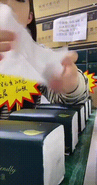 在名为“纸巾工厂”的直播间,能看到一包包纸巾在传送带上滑动。主播称,“所见即所得,工厂直发”。记者询问能否看下工厂全景,主播称,“看不了,架子是固定的,后面工人正在干活。”