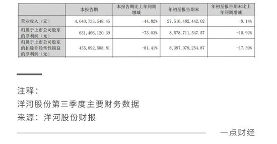 今年第三季度,洋河股份实现营收46.4亿元,同比下降44.82%;净利润6.3亿元,同比下降73.03%;扣非净利润4.6亿元,同比下降81.41%。