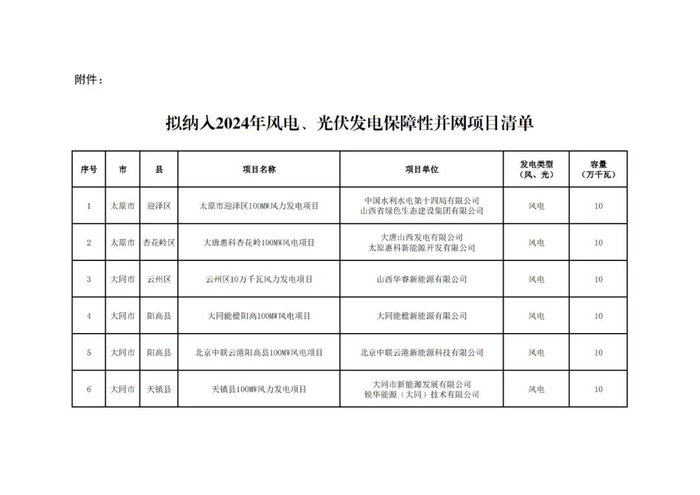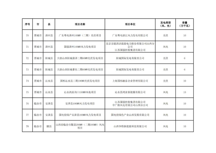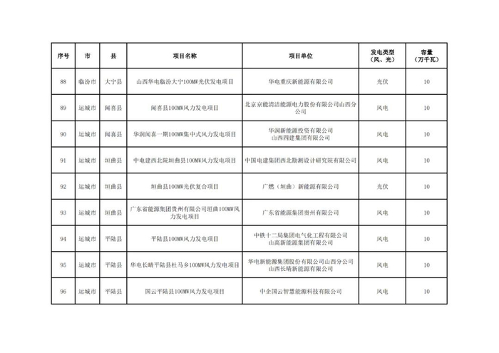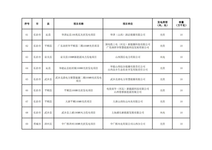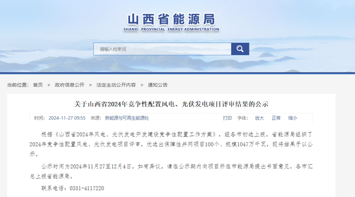根据《山西省2024年风电、光伏发电开发建设竞争性配置工作方案》,经各市初选上报,省能源局组织了2024年竞争性配置风电、光伏发电项目评审,优选出保障性并网项目100个、规模1047万千瓦,现将结果予以公示。