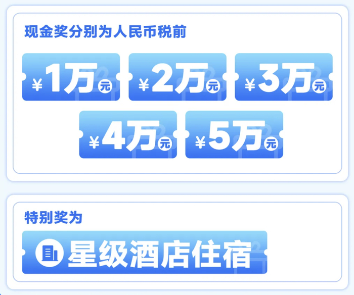 现金奖设人民币税前1万元、2万元、3万元、4万元、5万元5个等次,特别奖为星级酒店住宿。