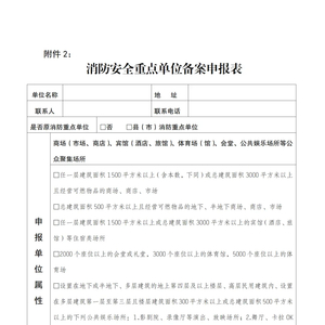 拟申报单位根据《消防安全重点单位申报表》(附件2),按照实际情况填写完成后,可通过现场、邮箱、传真、邮寄送达等方式向辖区消防部门进行申报备案。