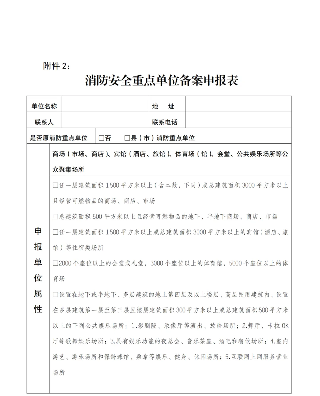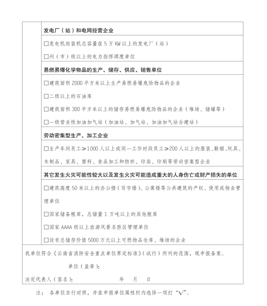 根据《云南省消防安全重点单位界定标准(试行)》的要求,请各社会单位对照标准,认真自查,凡符合该标准的单位,要主动向所在辖区的消防救援局进行申报,提交重点单位申报表(附件2),辖区消防救援局接报后,在3个工作日内进行核准确认。