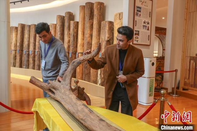 11月27日,参加2024洋网红“Talk and Show江西”之赣南行活动的10余位“洋网红”来到被誉为“中国实木家居之都”的江西赣州南康区,先后参观了赣州国际陆港、南康区家具新中心、南康家居小镇等地,深入了解南康区这座小城实现千亿年产值的家具大产业背后的故事。家具产业是赣州市南康区的传统优势产业、首位产业,拥有三十多年的发展历史,如今已是赣州市最具特色、规模最大的产业集群,主营业务年收入超2700亿元,品牌价值超700亿元。图为来自巴基斯坦的乔木(图右)在赣州国际陆港的进口商品展示交易中心拍摄。中新社记者 刘力鑫 摄