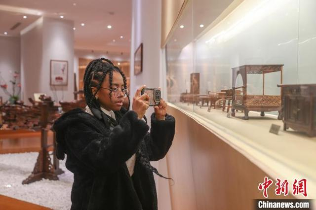 11月27日,参加2024洋网红“Talk and Show江西”之赣南行活动的10余位“洋网红”来到被誉为“中国实木家居之都”的江西赣州南康区,先后参观了赣州国际陆港、南康区家具新中心、南康家居小镇等地,深入了解南康区这座小城实现千亿年产值的家具大产业背后的故事。家具产业是赣州市南康区的传统优势产业、首位产业,拥有三十多年的发展历史,如今已是赣州市最具特色、规模最大的产业集群,主营业务年收入超2700亿元,品牌价值超700亿元。图为“洋网红”在南康家居小镇的家具博览中心参观拍摄。中新社记者 刘力鑫 摄