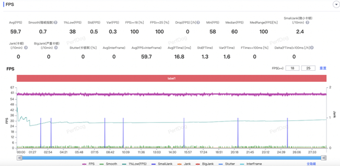 由于是插帧,因此在Perfdog中测出来的是游戏插帧前的原生帧率,实际游戏体验要比60帧模式更加丝滑,没有出现卡顿情况。