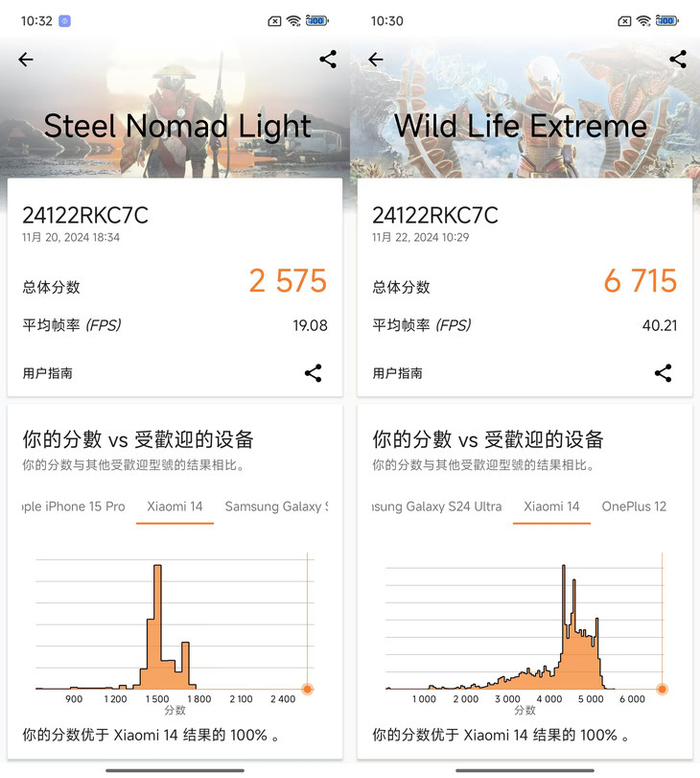 GPU部分的测试项目为3DMark的Steel Nomad Light与Wild Life Extreme,最终的总成绩分别为2575与6715分,对比搭载第三代骁龙8的产品也有显著增强。