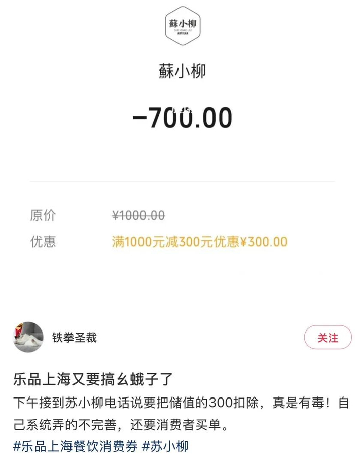 社交平台上,还有网友爆料称餐饮商户苏小柳,同意将“乐品上海”餐饮消费券用于储值卡充值,后期却反悔并电话通知消费者将把储值优惠金额扣除。