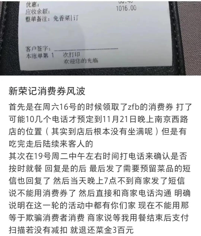 对此,新荣记表示:餐厅原来大都是预约制,部分持消费券用户未预约来店需要排号等候,同时看到店内有已预约的空位后产生不满,发布差评对餐馆声誉带来影响,所以决定退出。