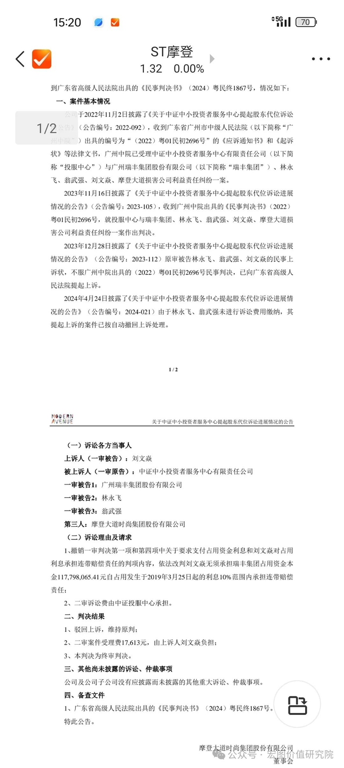 陷入困境的摩登大道发布公告,因大股东无法偿还占用公司的资金,停牌 2 个月,如果再还不了就退市。摩登因为虚假信息已经被证监会处罚,然后被法院判决公司和当时任赔偿投资者损失。而整个摩登案中最悲催的可能是时任董事财务总监的刘文焱。