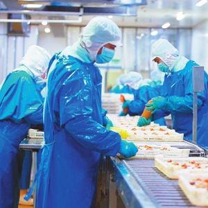 在位于大连湾的大连瑞驰食品有限公司预制菜生产车间,一台台自动化生产设备有序运转,工人们按照工艺流程在各自工位上忙碌着,生产线上鲜嫩水灵的扇贝、粉丝、鳕鱼等食材在经过蒸煮、挂浆、预炸、速冻等一系列工序后,被制作成不同品类的半成品套袋装箱,进入下一道工序,最终作为海鲜预制菜进入市场。
