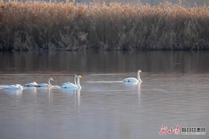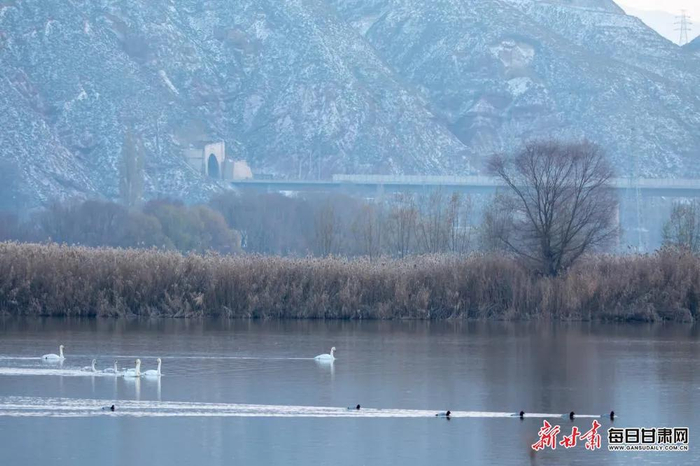 11月26日,位于兰州市西固区达川镇的三江口天鹅滩,已陆续迎来9只白天鹅在此越冬,它们洁白的羽毛与冬日的黄河水相互映衬,构成了一幅优美的生态画卷。