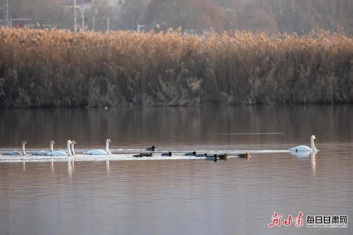 近年来,兰州市大力推进境内黄河流域综合治理,生态环境持续改善,为白天鹅、凤头鸊鷉、鸬鹚、灰雁、绿翅鸭等候鸟营造了适宜的栖息环境,吸引它们前来越冬。