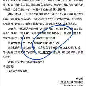 11月26日,一封主题为《2025年比亚迪乘用车降本要求》的邮件流出。邮件内容显示,在成为全球首家达成第1000万辆新能源汽车下线的车企之际,比亚迪要求相关供应商所供货产品从2025年1月1日起降价10%。
