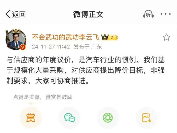 11月27日中午,比亚迪集团品牌及公关处总经理李云飞发布微博疑似回应该传闻。他表示“与供应商的年度议价,是汽车行业的惯例。我们基于规模化大量采购,对供应商提出降价目标,非强制要求,大家可协商推进”。