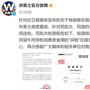 华莱士表示,同袋牛肉饼和消费者食用的“异物”在报告出具后也会第一时间公示。