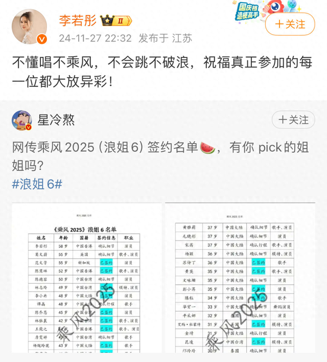 李若彤发文否认参加浪姐6录制:不懂唱不乘风,不会跳不破浪