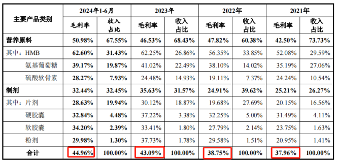 从产业链的利润空间角度看,终端品牌的代表性企业汤臣倍健披露的主营业务综合毛利率分别为2021年66.68%、2022年68.73%、2023年69.35%和2024年1-6月69.16%,大幅高于营养原料供应商。招股说明书显示,2023年营养原料供应商行业内企业的主营业务毛利率在30%-45%之间,且从技源集团2021年至今的数据来看公司毛利率稳定提升。培养自主品牌究竟是为了提升HMB普及度,还是为了提高毛利,不得而知。