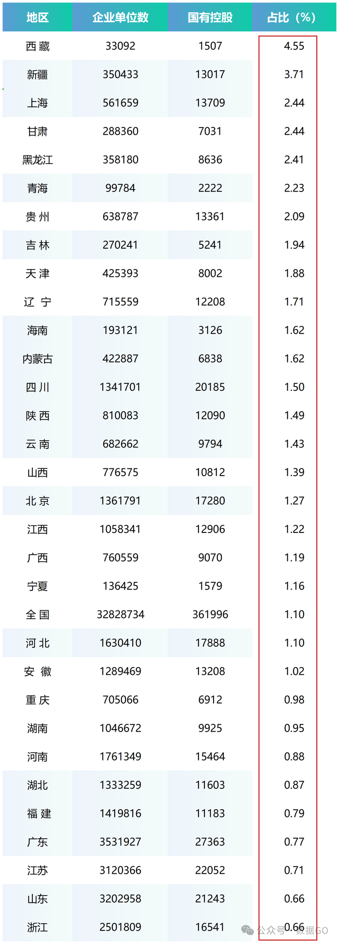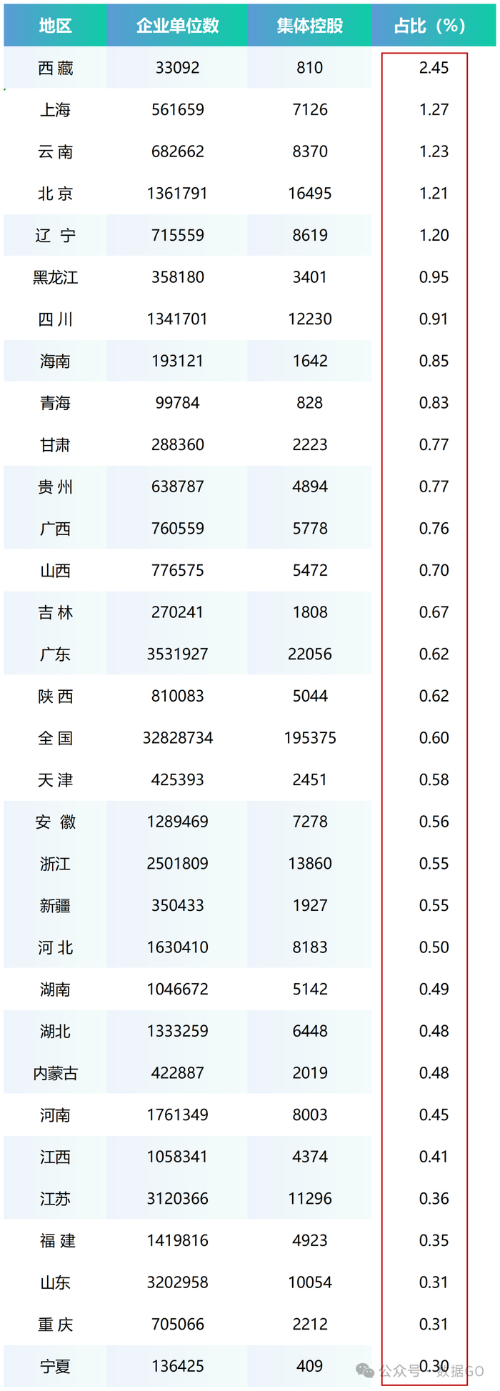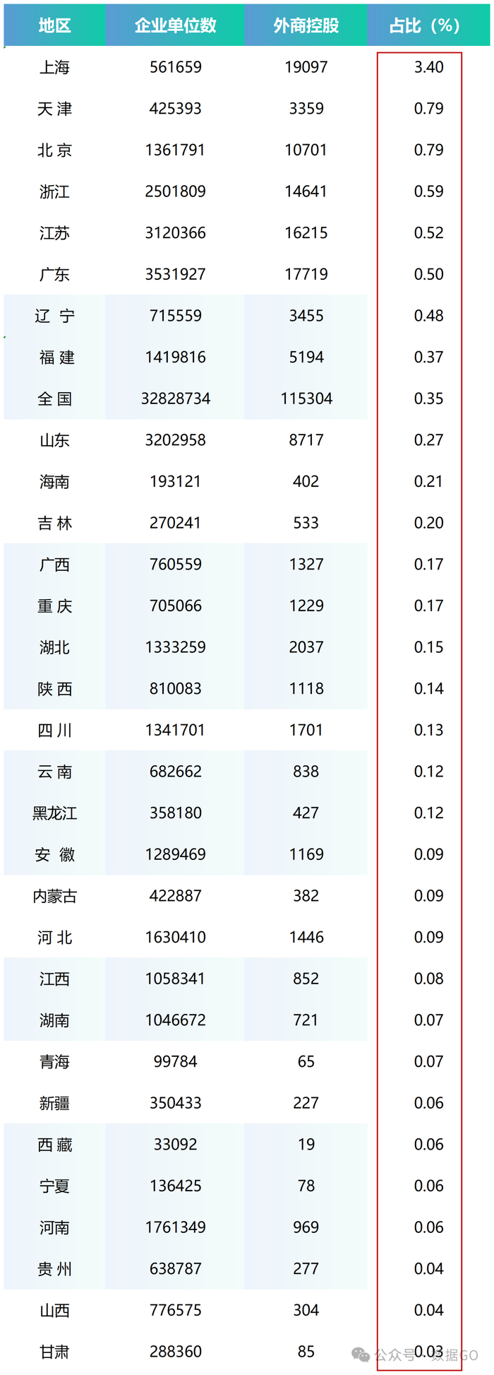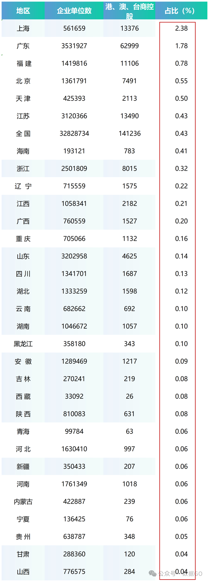 表:31省市港澳台商控股企业数量占企业总数量比例排名
