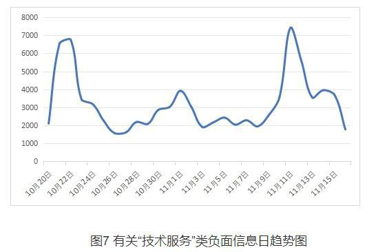监测期间,“技术服务”类负面信息共89367条,日均3192条。互联网技术的不当应用给消费者造成困扰。有消费者反映,“双11”期间莫名被开通“先用后付”,并出现重复扣款情况;媒体也曝光了部分平台存在短信骚扰用户、水军刷好评等行为,令消费者不堪其扰。