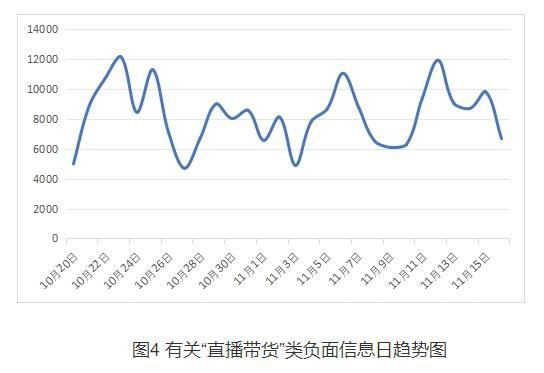 直播电商经营火爆,淘宝直播成交破亿直播间达119个。与此同时,假冒伪劣、虚假宣传等问题投诉增幅明显,央视在“双11”期间对网络主播带货套路进行起底。监测期间,有关“直播带货”负面信息共230675条,日均8238条。曲线峰值在活动伊始即出现,周期内存在多次波动。