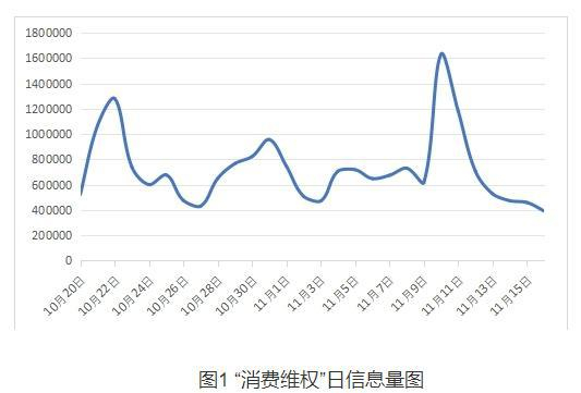 在10月20日至11月16日共计28天监测期内,共收集到“消费维权”相关信息20176208条,日均约72万条。10月20日、11月1日、11月11日节点前后时段波动明显,11月10日达到峰值,为1630034条。