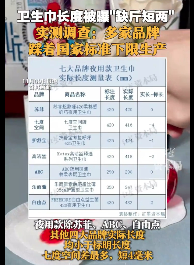 有网友近期发现,多个品牌的卫生巾存在“缺斤少两”的现象,其实际长度小于外包装标明的长度;如果只看能吸收液态物质的内吸收层,则长度差距更大。11月7日,有媒体购买了七大品牌的卫生巾进行实测,多家品牌都有此问题。