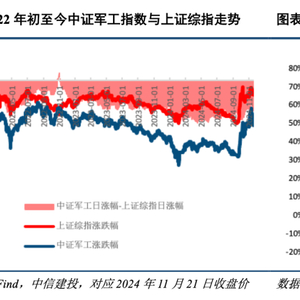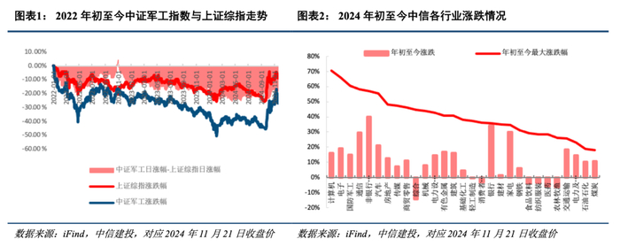 截止到2024年11月21日,军工板块呈现先抑后扬走势,军工行业自2023年起进入调整期,2024年前三季度受多重因素影响,军工板块除船舶外,整体业绩持续承压。由于人事调整、订单推迟及行业降价等因素影响,前三季度跑输大盘。9月24日以来,整体市场持续回暖,受人事调整基本落地、订单逐步恢复、珠海航展开幕等因素影响,军工板块最高涨幅达50%。