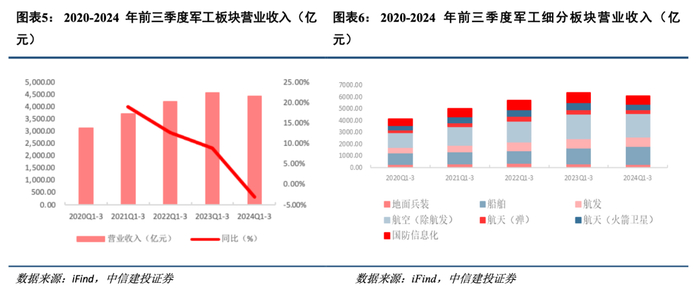 国防军工板块营收利润下滑,关注军工板块结构性复苏。军工板块发布2024年三季报,板块共实现营业收入4444亿元,同比下降3.05%。分板块来看,船舶和航发是两个营收维持正增长的板块。