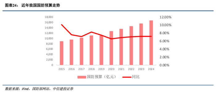 中美关系先抑后扬,短期边际回暖,中长期战略竞争态势不变。俄乌冲突、巴以冲突长期化,其他热点地区风波不断。特朗普重返白宫后或将出台更多限制政策,中美战略竞争态势大概率继续强化,特朗普目前提名内阁人员名单中,担任重要职位的国务卿和国家安全顾问均为对华鹰派分子,未来中美对抗局势或将持续高压。国际局势波云诡谲,国内需求持续旺盛的同时,军贸市场有望成为第二增长曲线,国防军费保持长期稳健增长大势所趋。2024年全国财政安排国防支出预算16655.4亿元,增长7.2%,增幅较2023年持平,高于2024年GDP预计增幅5%,总额再创新高。预计十四五后期我国国防预算仍将保持7-7.5%左右的稳定增长,占GDP比重或有一定提升空间。