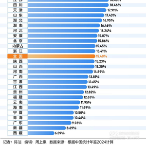 从各省的情况来看,老年抚养比则呈现明显差别。有5个省份的老年抚养比不足15%,但是也有9个省份的老年抚养比超过25%,这意味着在这些省份中,不到4个成年人就需要抚养1位老年人。